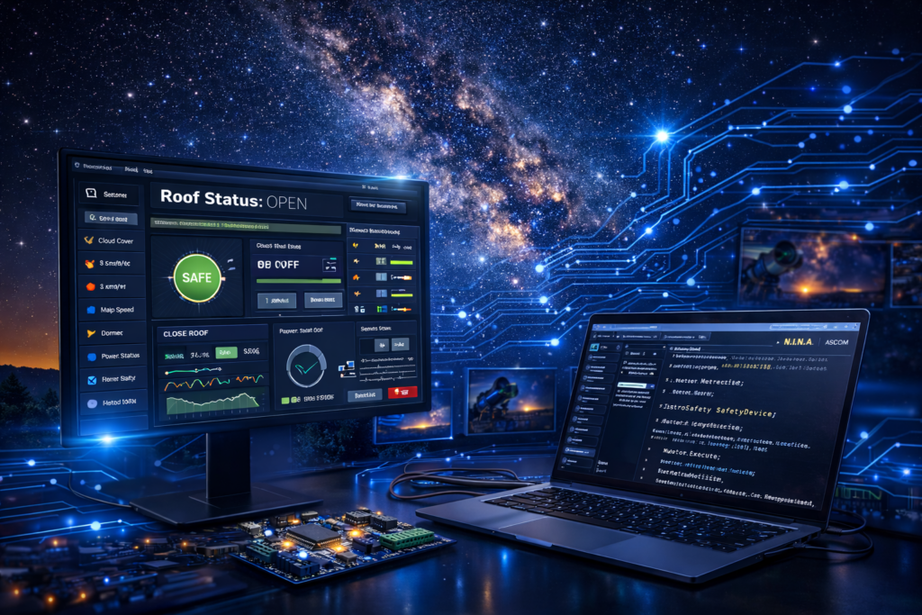 De software maakt het mogelijk om observatoriumdaken veilig te bedienen en te monitoren, terwijl integratie met moderne astronomiesoftware mogelijk blijft.
